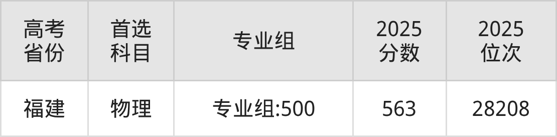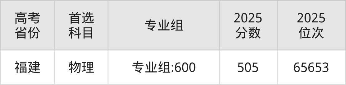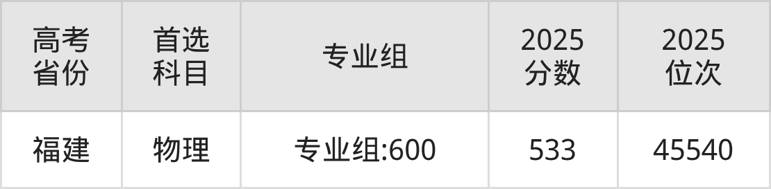 | 高考 省份 | 专业组 | 选科要求 | 2025 分数 | 2025 位次 |