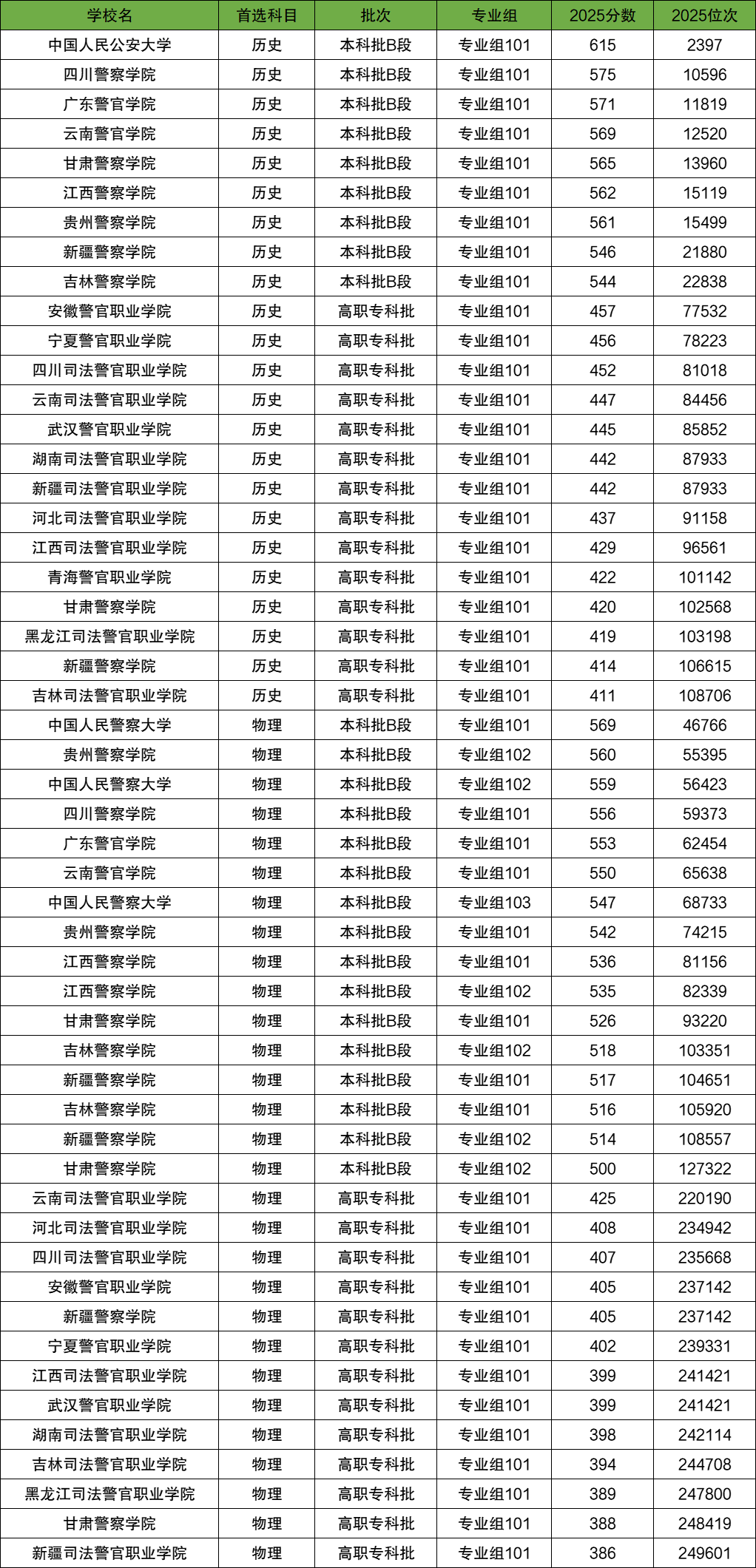 2025年国内各大警校在四川历史类收分最高的学校为中国人民公安大学(专业组101),2025年最低分为615分;收分最低的大学为吉林司法警官职业学院(专业组101),2025年最低分为411分;