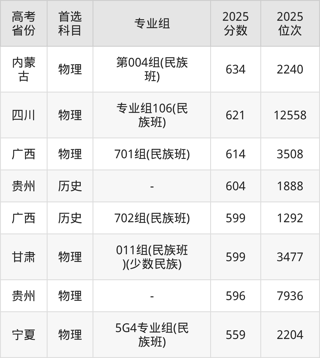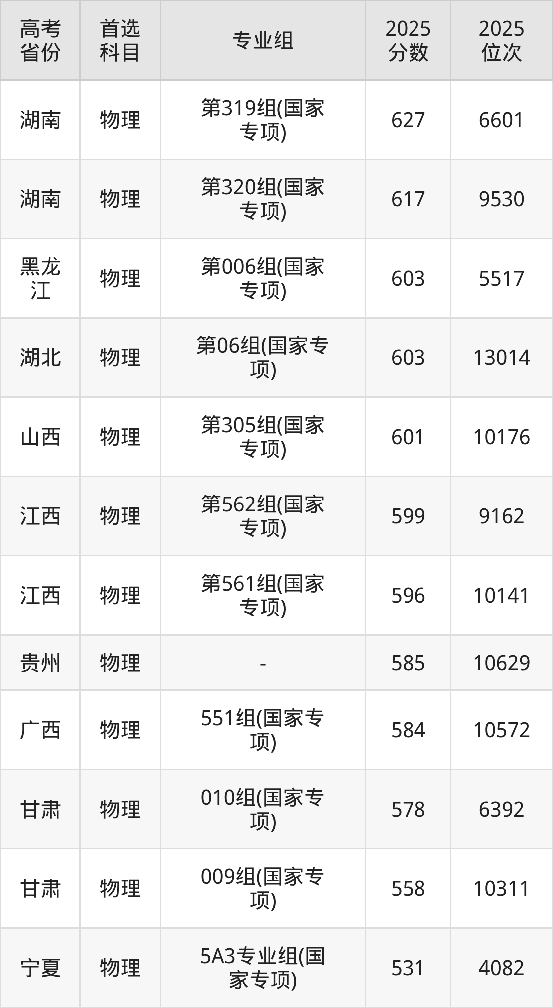 下方图片展示的是华南理工大学国家专项2025年录取分数线汇总: