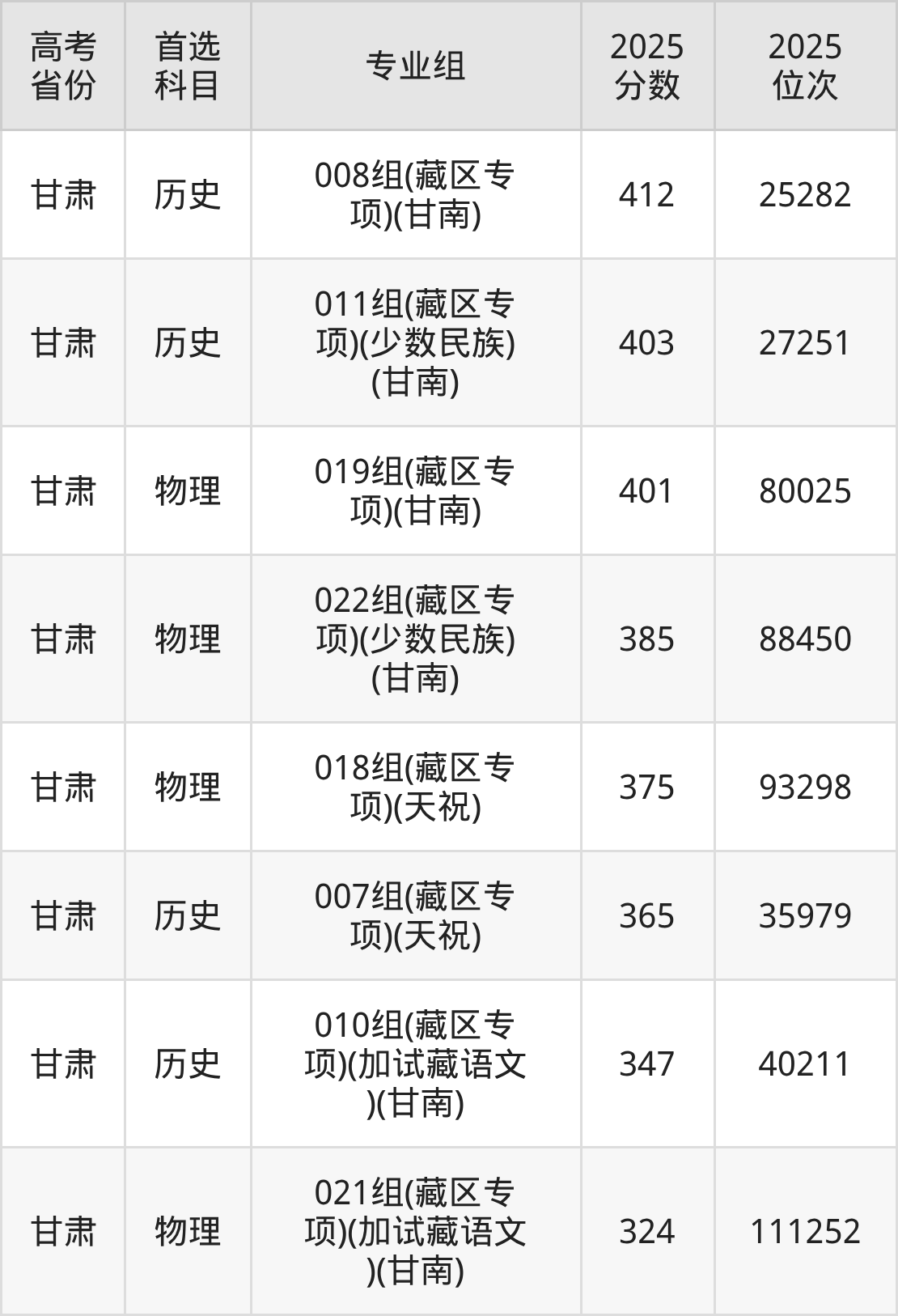 下方图片展示的是甘肃林业职业技术大学藏区专项2025年录取分数线汇总: