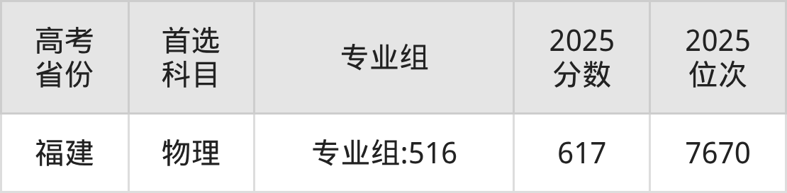 | 高考 省份 | 专业组 | 选科要求 | 2025 分数 | 2025 位次 |