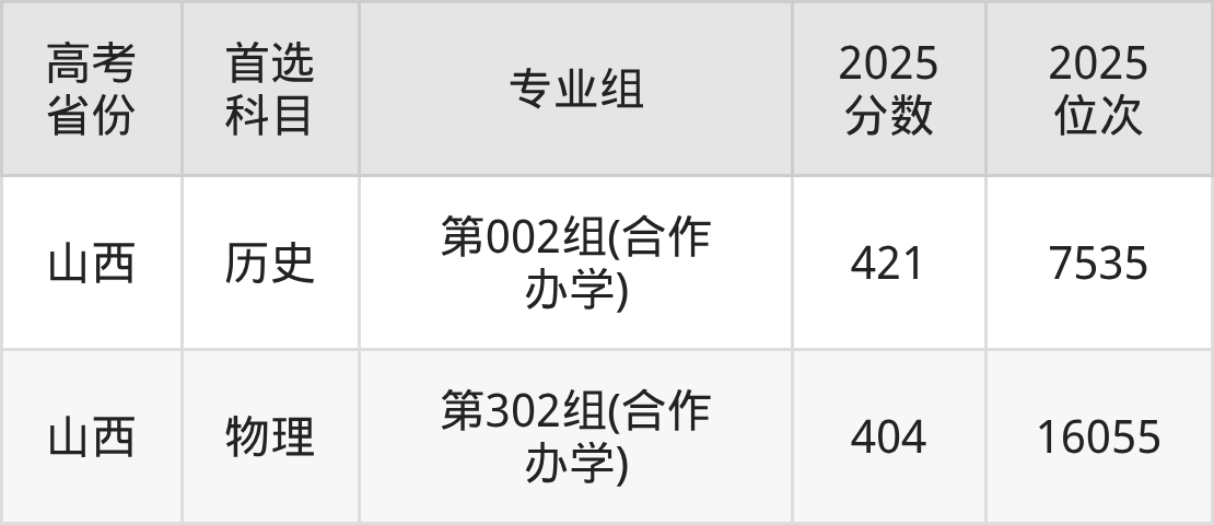 | 高考 省份 | 专业组 | 选科要求 | 2025 分数 | 2025 位次 |