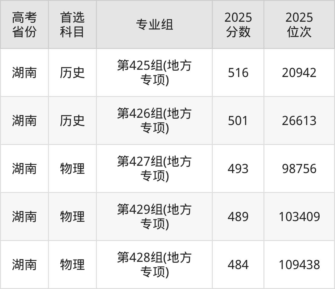 以2025年湖南高考为例,吉首大学地方专项历史类的最低分是501分、普通本科批历史类的最低分是506分。与普通本科批相比,地方专项的最低分降低了5分。