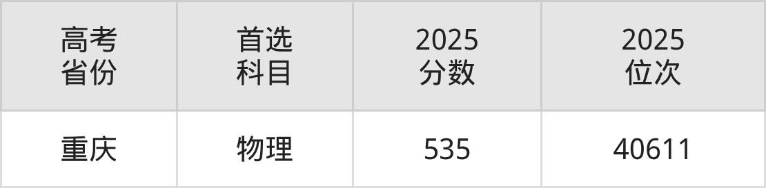 | 高考 省份 | 专业组 | 选科要求 | 2025 分数 | 2025 位次 |