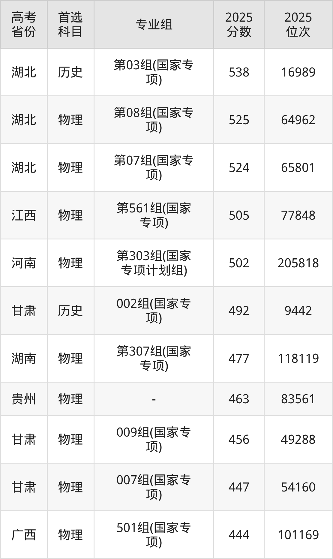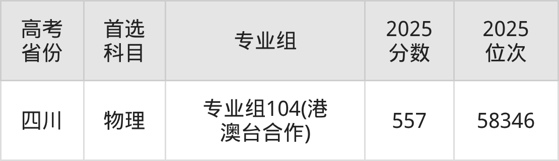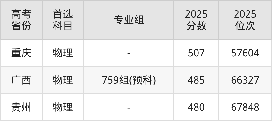 | 高考 省份 | 专业组 | 选科要求 | 2025 分数 | 2025 位次 |