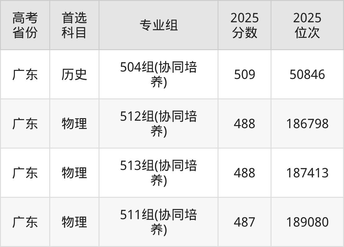 下方图片展示的是广东交通职业技术学院协同培养2025年录取分数线汇总:
