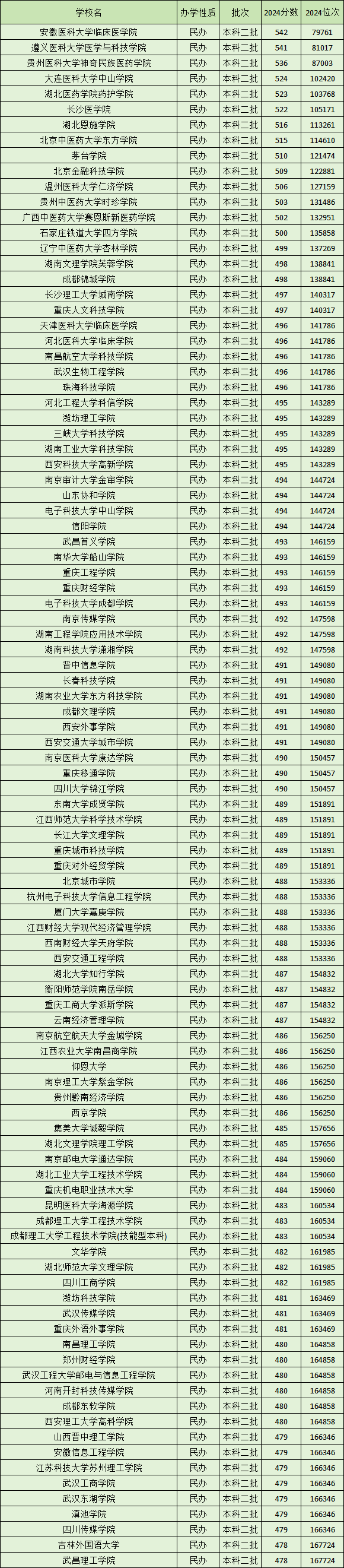 下面是2024全国民办二本大学在四川理科招生的前100名录取分数线一览表。