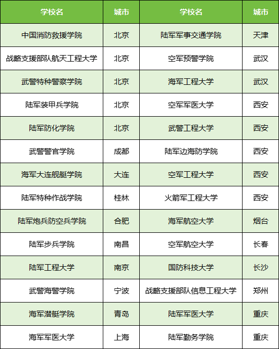 北京市:中国消防救援学院、战略支援部队航天工程大学、武警特种警察学院、陆军装甲兵学院、陆军防化学院;