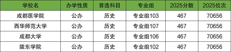 2025年四川历史类本科批分数线为467分,在四川历史类收分低的公办本科大学有成都医学院、西华师范大学、成都大学、陇东学院等院校,这几所大学的录取分数均为467分,刚好压本科线进行招生。
