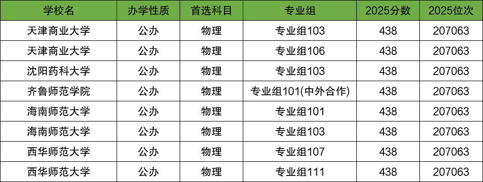 2025四川物理类本科批分数线为438分,在四川物理类收分低的公办本科大学有天津商业大学、沈阳药科大学、齐鲁师范学院、海南师范大学等院校,这几所大学的录取分数均为438分,刚好压二本线进行招生。