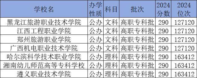 文科290分能上的大学有黑龙江旅游职业技术学院、江西工程职业学院、郑州旅游职业学院、广西机电职业技术学院;理科290分能上的大学有哈尔滨科学技术职业学院、湘南幼儿师范高等专科学校、遵义职业技术学院。
