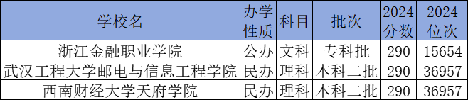 文科290分能上的大学有浙江金融职业学院;理科290分能上的大学有武汉工程大学邮电与信息工程学院、西南财经大学天府学院。