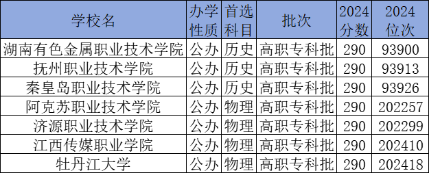 历史类290分能上的有湖南有色金属职业技术学院、抚州职业技术学院、秦皇岛职业技术学院;物理类290分能上的有阿克苏职业技术学院、济源职业技术学院、江西传媒职业学院、牡丹江大学。