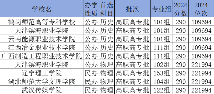 历史类290分能上的有鹤岗师范高等专科学校、天津滨海职业学院、云南能源职业技术学院、江西冶金职业技术学院、广西制造工程职业技术学院;物理类290分能上的有天津滨海职业学院、辽宁理工学院、湖北师范大学文理学院、武汉传媒学院。