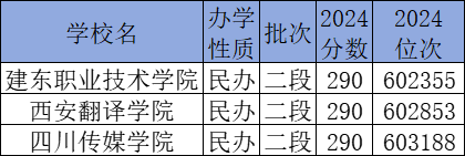 290分能上的大学中民办性质的有建东职业技术学院、西安翻译学院、四川传媒学院。