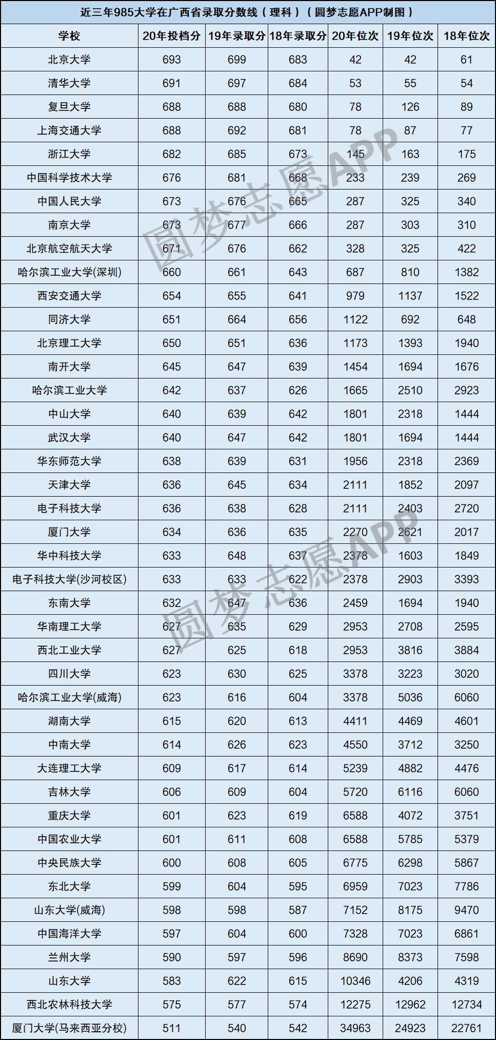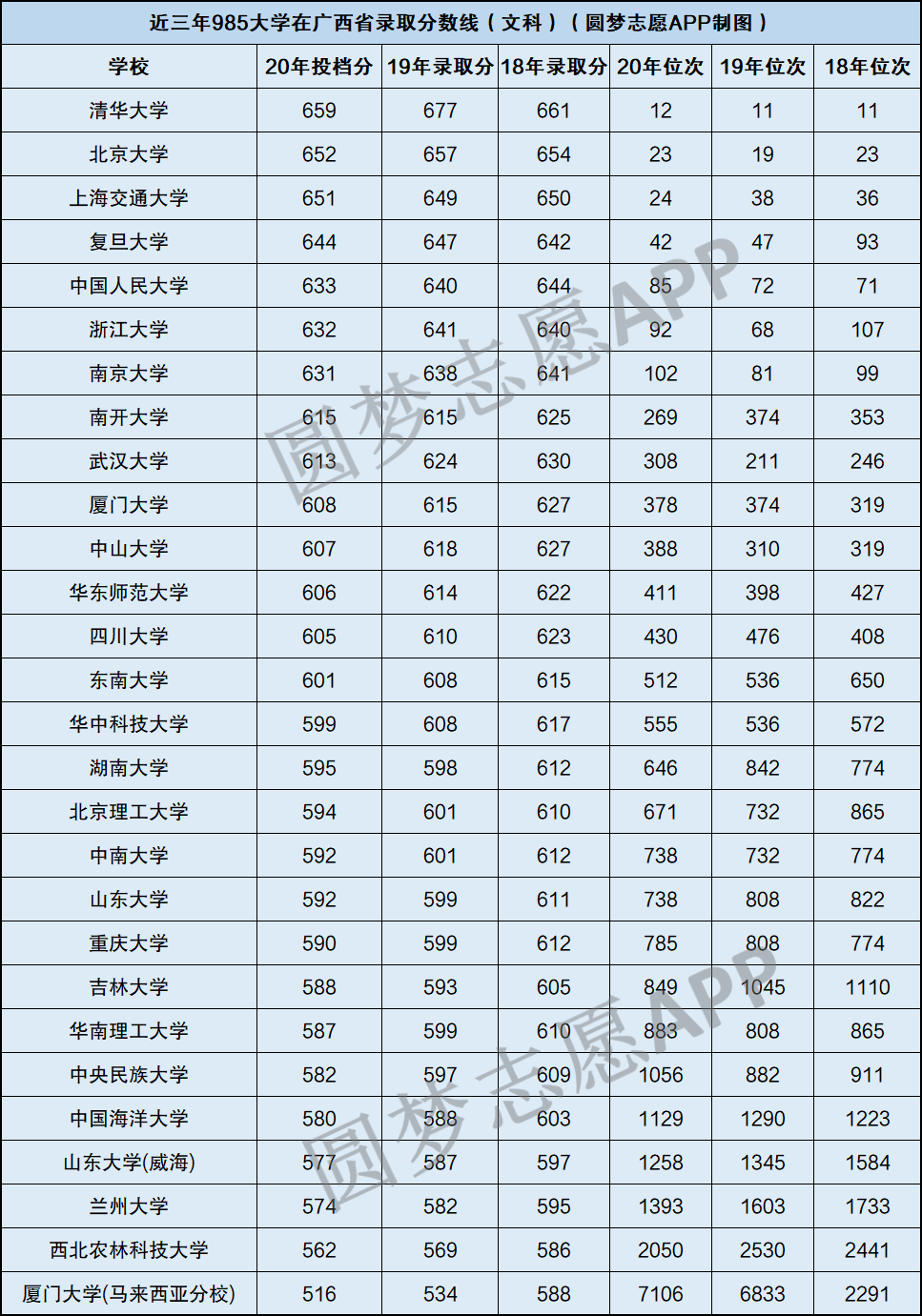 根据近三年广西省教育考试院公布的招录数据,小编整理出在广西省进行招生的985大学文科和理科的录取情况,具体录取分数线如下: