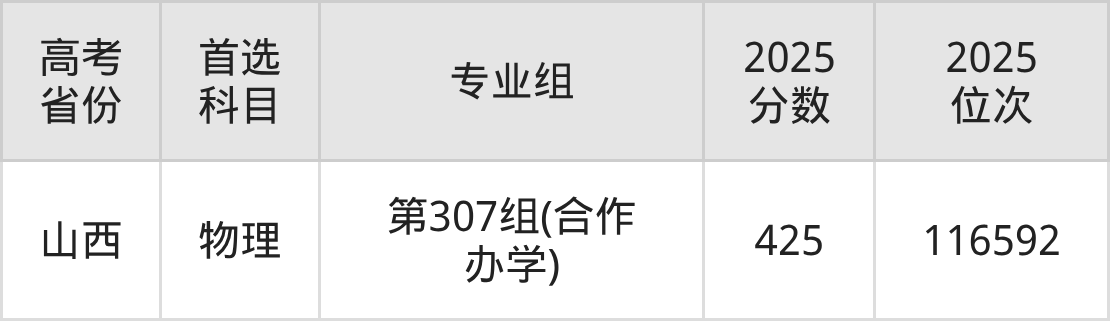 | 高考 省份 | 专业组 | 选科要求 | 2025 分数 | 2025 位次 |