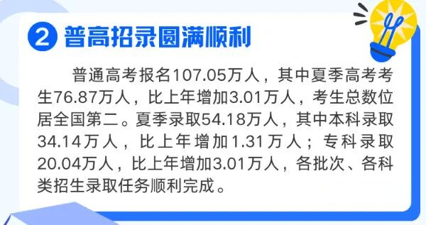 2024年:全省高考报名107.05万人,其中夏季高考考生76.87万人,比2023年增加3.01万人。