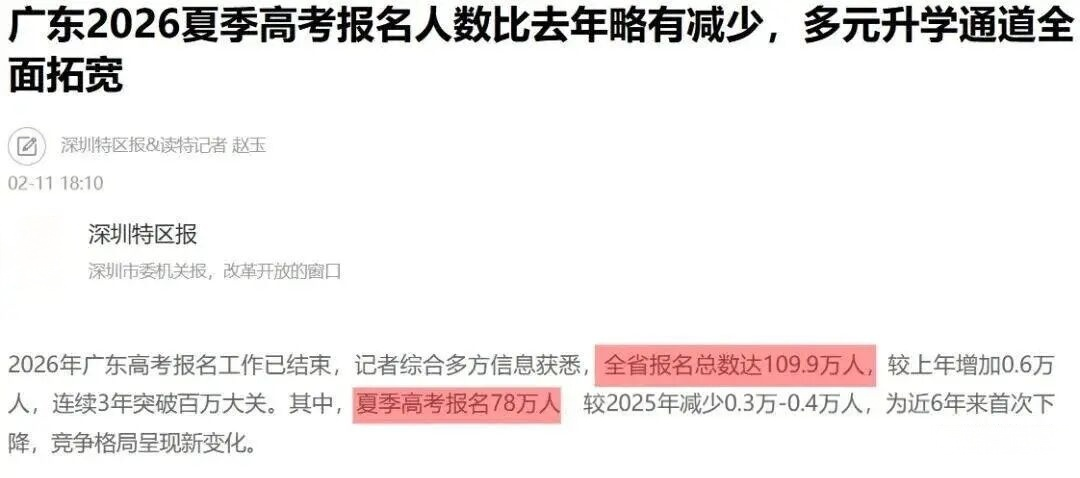 据深圳特区报记者综合多方信息获悉,2026年全省高考报名总数达109.9万人,较上年增加0.6万人,连续3年突破百万大关。其中,夏季高考报名78万人,较2025年减少0.3万-0.4万人,为近6年来首次下降。