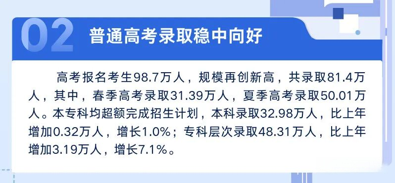 2023年:全省高考报名98.7万人,其中夏季高考报名约73.9万人。