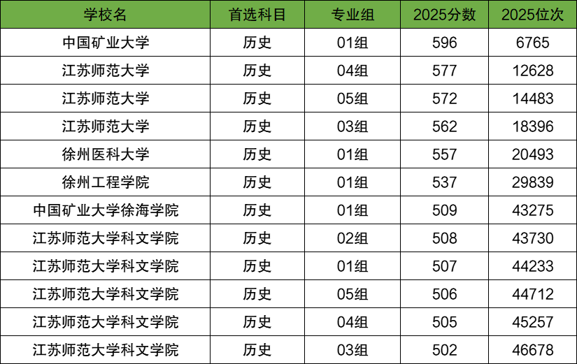 2025年徐州本科各大学中,在历史类分数线最高、最难考的院校是中国矿业大学(01组),2025年录取分数596分,录取位次6765位;