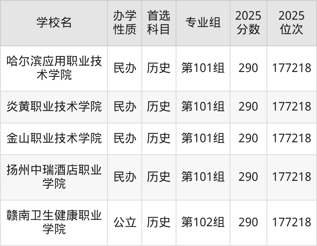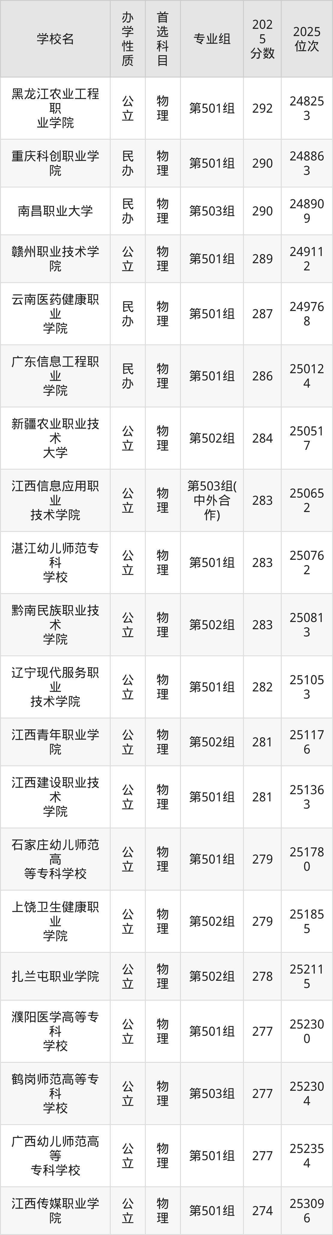 江西物理组282分排名在24.8万-25.3万名左右,能够上公办本科、民办本科、优质专科高职院校。老师推荐的有新疆农业职业技术大学第502组(284分、排名250517)、南昌职业大学第503组(290分、排名248909)、黑龙江农业工程职业学院第501组(292分、排名248253)。