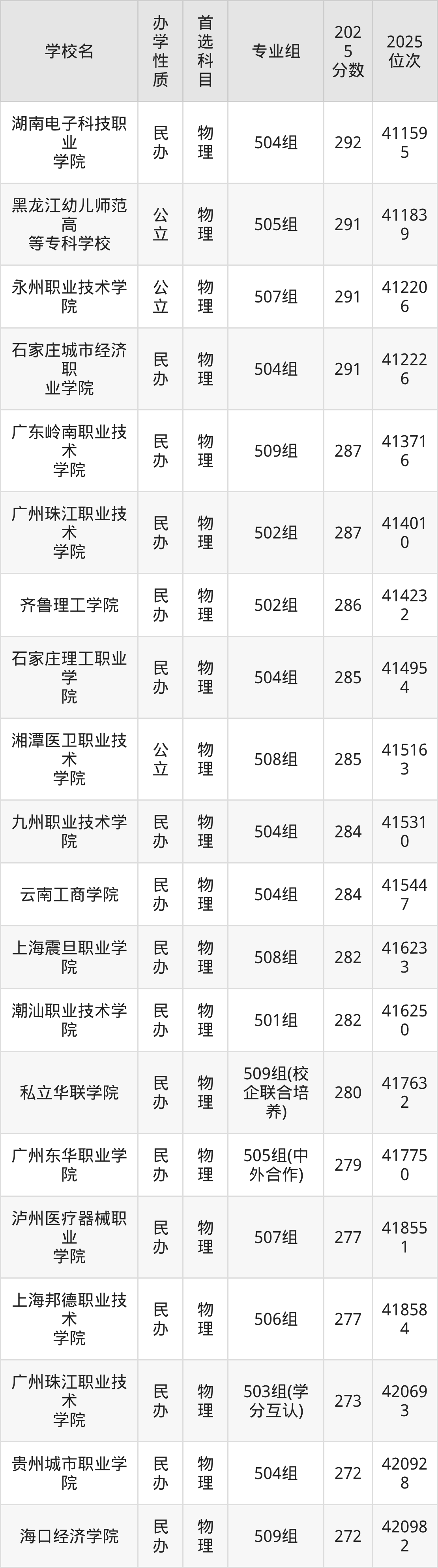 广东物理组282分排名在41.2万-42.1万名左右,能够上双万计划、民办本科、国家示范高职院校。老师推荐的有齐鲁理工学院502组(286分、排名414232)、云南工商学院504组(284分、排名415447)、海口经济学院509组(272分、排名420982)、永州职业技术学院507组(291分、排名412206)等。