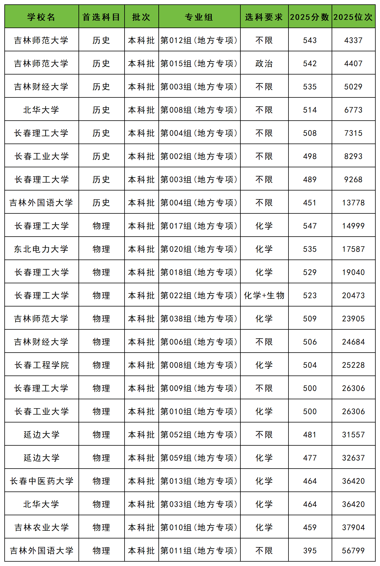 另外吉林地方专项计划录取分数线最高的大学:历史类为吉林师范大学(012组,543分);物理类为长春理工大学(017组,547分)。