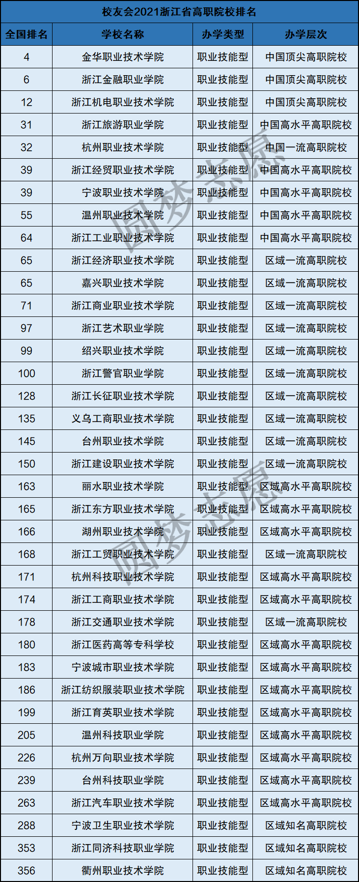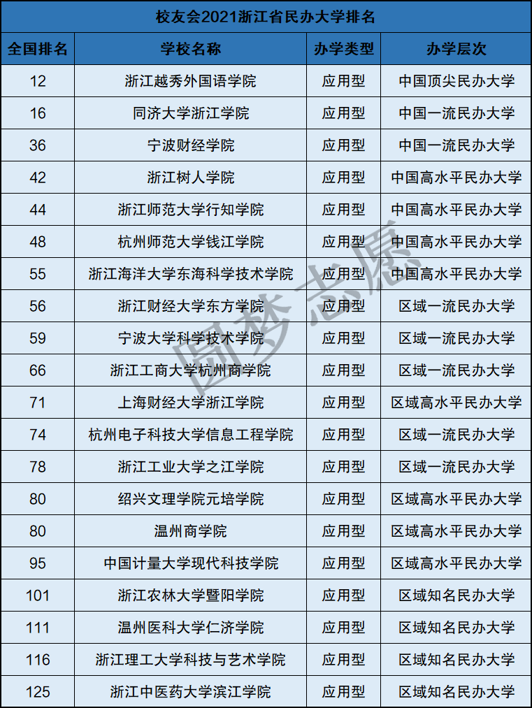 上文已列举了浙江公立大学的排名,以下是浙江民办大学以及高职类院校的情况: