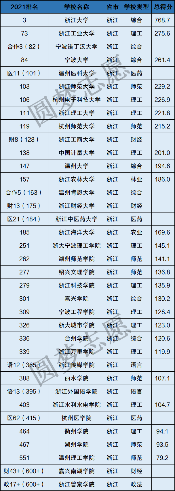一:浙江所有大学排名2021最新排名