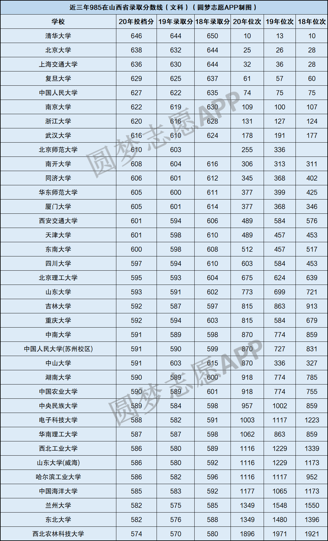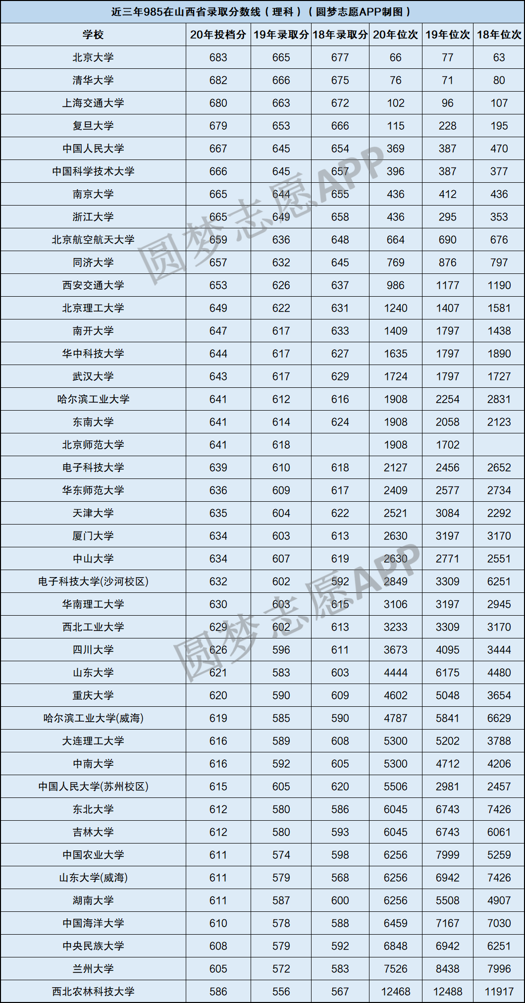 根据近三年山西省教育考试院公布的招录数据,小编整理出在山西进行招生的985大学文科和理科的录取情况,具体录取分数线如下: