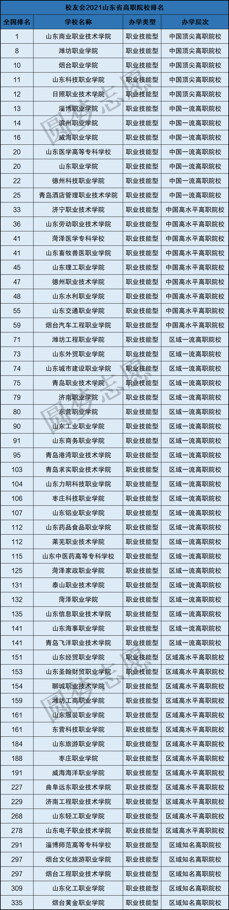 进入榜单的高职类院校共有61所,数量很多。其中山东商业职业技术学院排名全国第一,是中国顶尖的高职院校。进入全国前十名的高职院校有3所,潍坊职业学院排名第8,烟台职业学院排名第10。