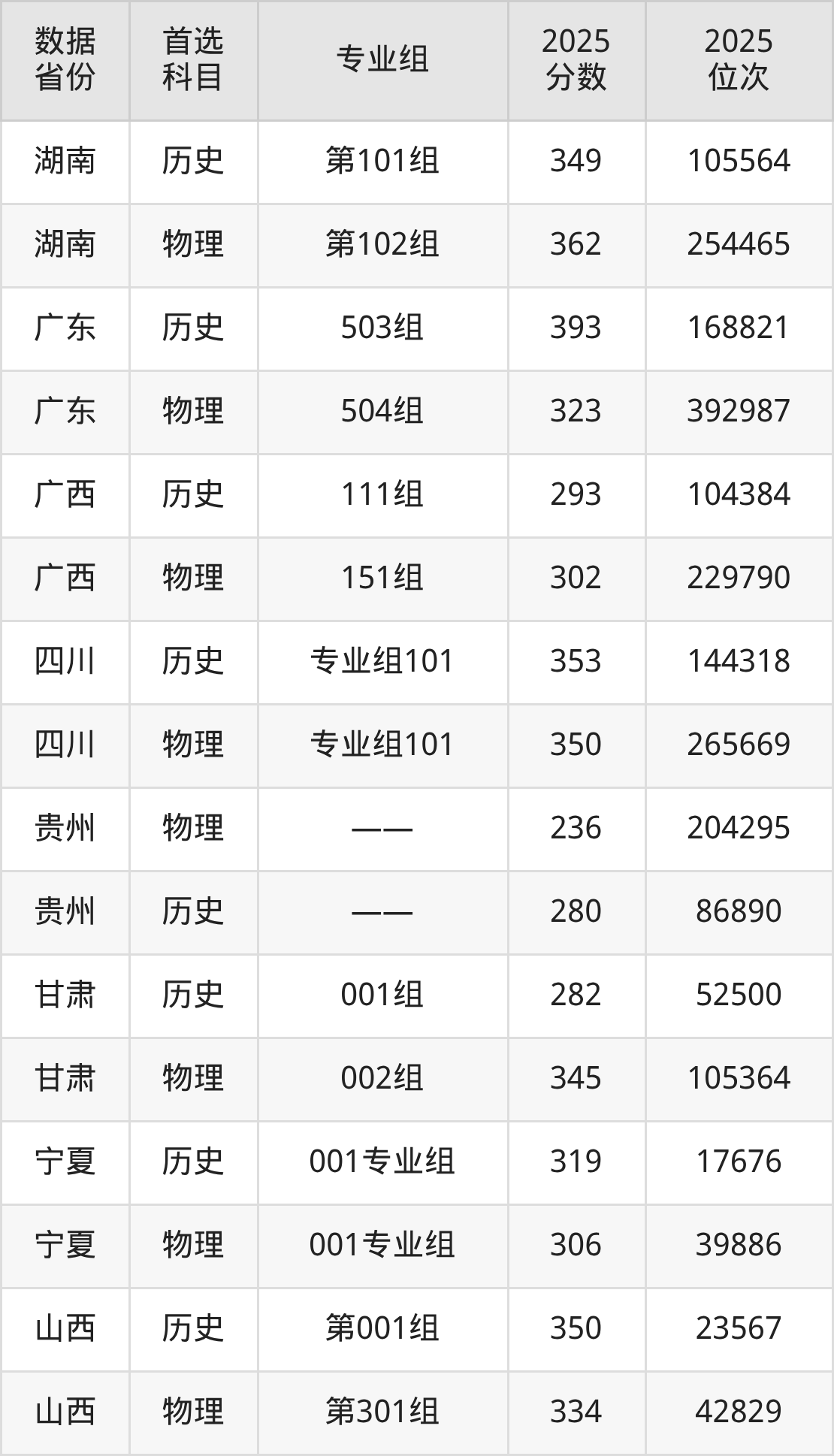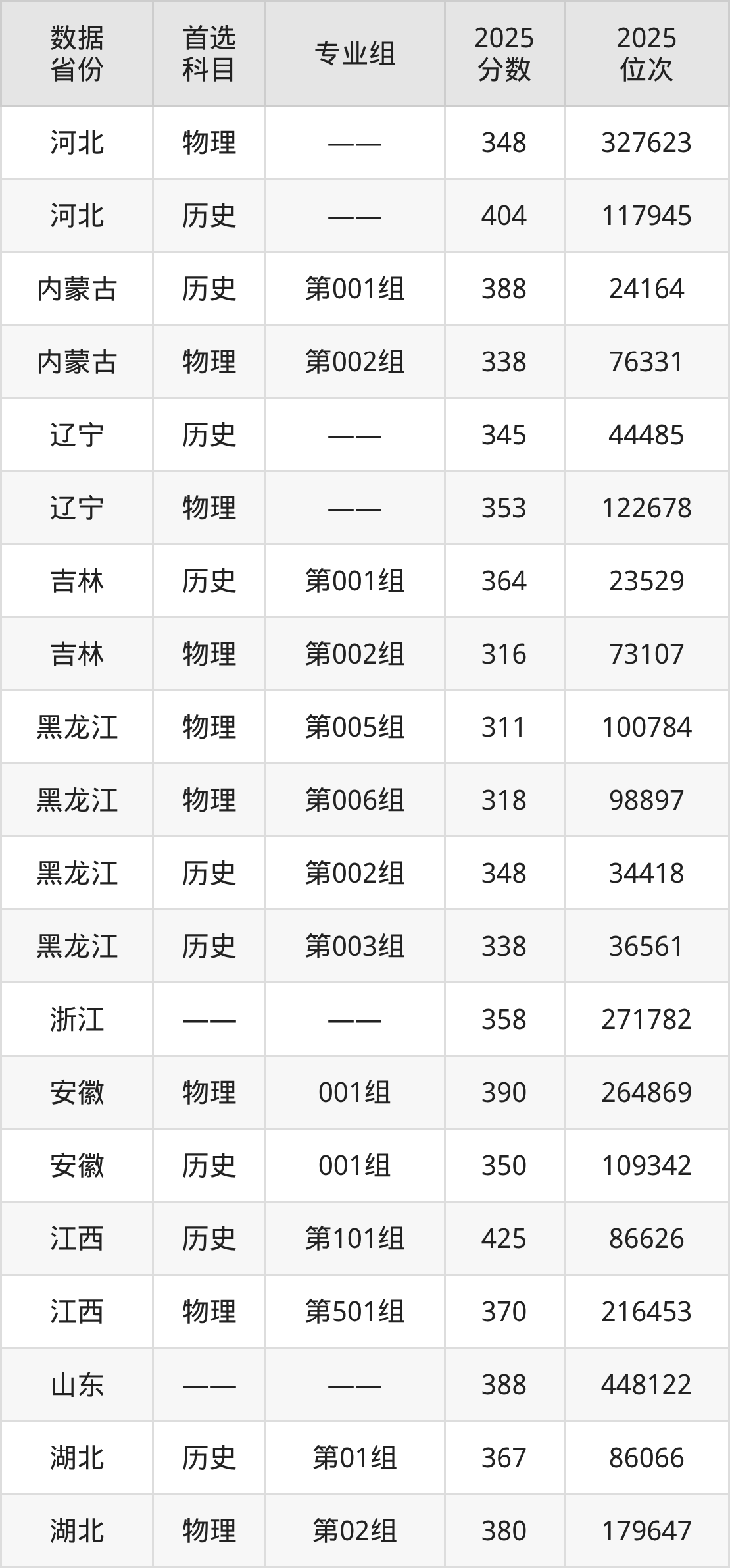 2025年黑龙江职业学院全国录取分数线最低是236分,最高是425分,平均分在344分左右。在多数地区录取最低分均超过280分。低于280分能上的地区只有贵州,高于平均值较多的是江西、河北、广东和安徽等地,均有专业组最低分在390分及以上。