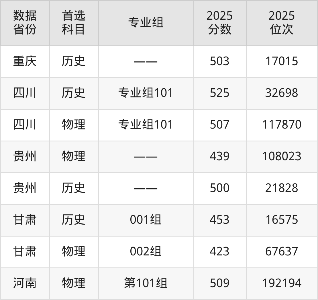 2025年凯里学院全国录取分数线最低是423分,最高是560分,平均分在491分左右。在多数地区录取最低分均超过450分。低于450分能上的地区只有广西、贵州和甘肃,高于平均值较多的是四川、广东、河北和江西等地,均有专业组最低分在516分及以上。