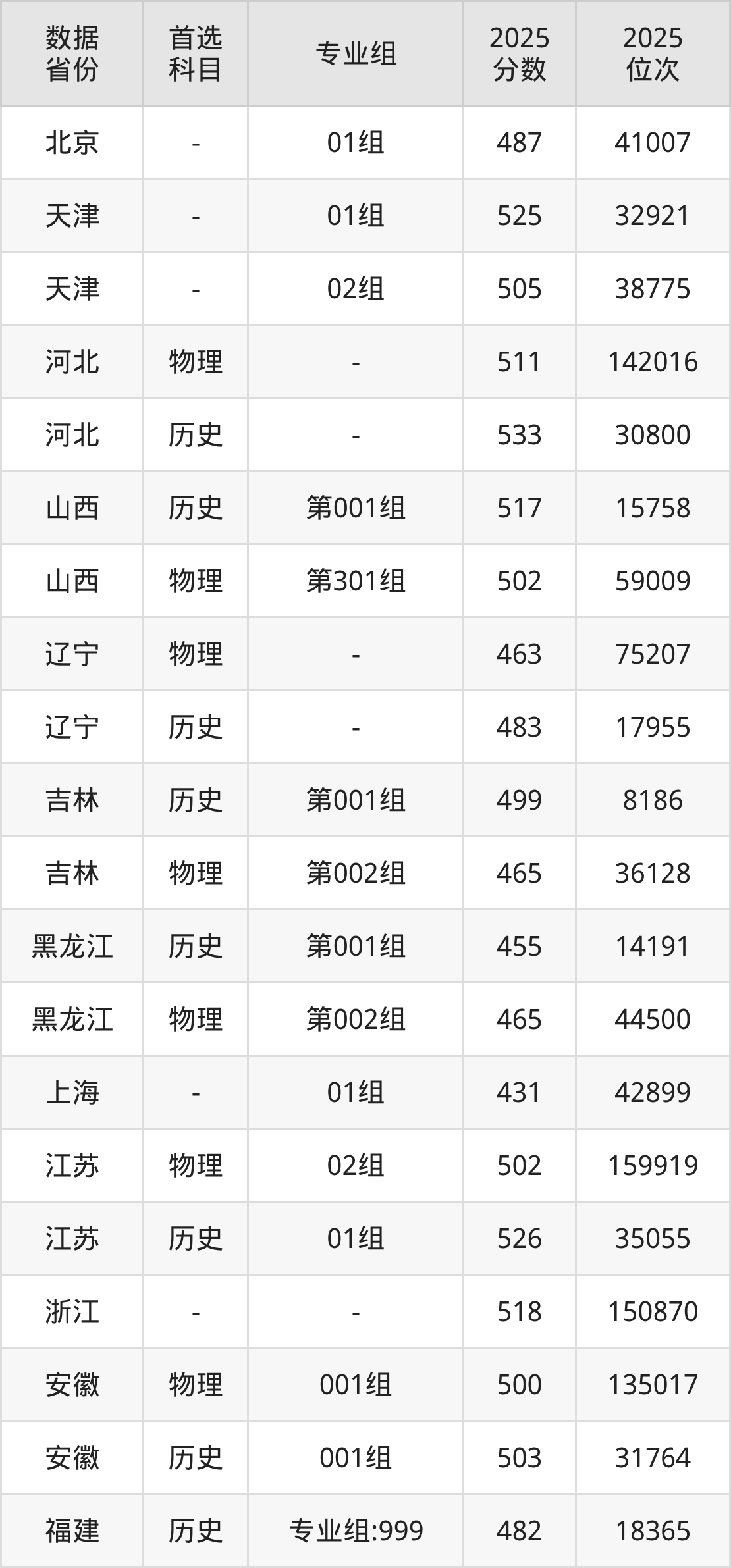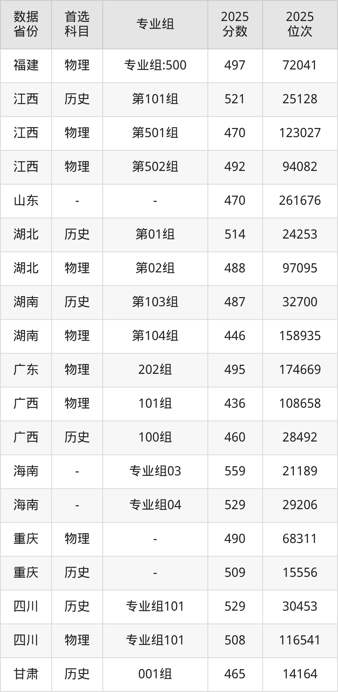 2025年宝鸡文理学院全国录取分数线最低是431分,最高是559分,平均分在493分左右。在多数地区录取最低分均超过450分。低于450分能上的地区只有湖南、广西和上海,高于平均值较多的是河北、海南、四川和江苏等地,均有专业组最低分在526分及以上。