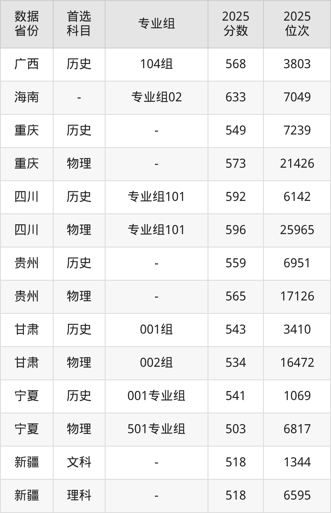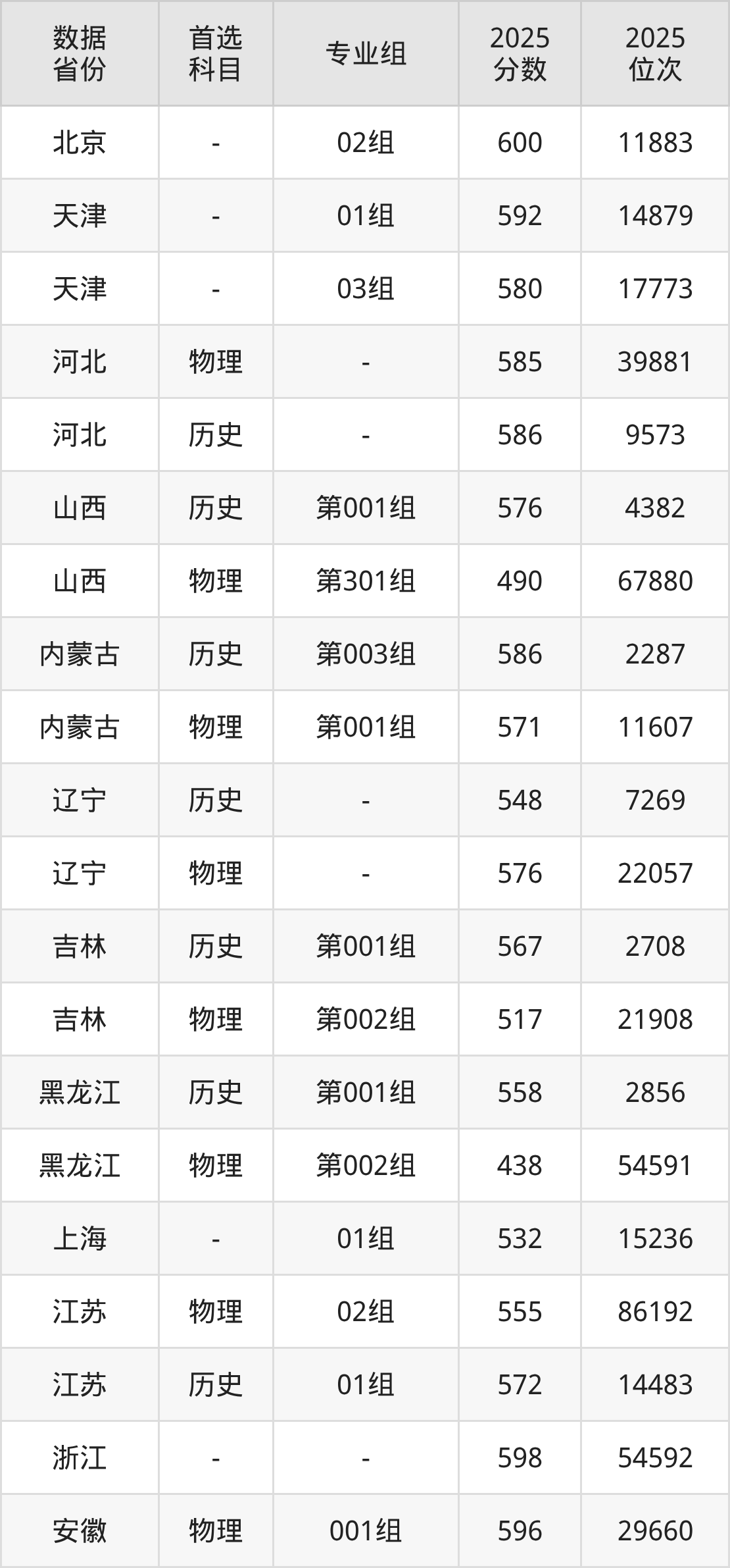 2025年南方医科大学全国录取分数线最低是438分,最高是650分,平均分在565分左右。在多数地区录取最低分均超过500分。低于500分能上的地区只有山西和黑龙江,高于平均值较多的是海南、北京、浙江和安徽等地,均有专业组最低分在596分及以上。