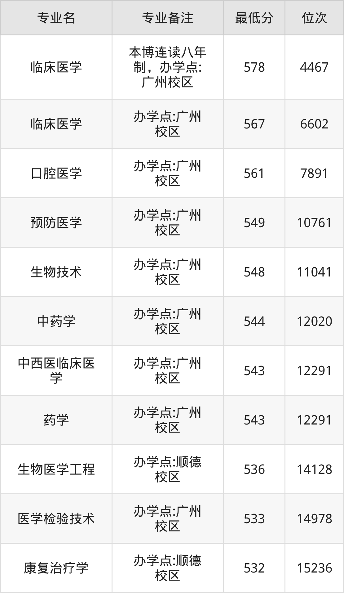 1、临床医学(本博连读八年制,办学点:广州校区):578分、位次4467名;