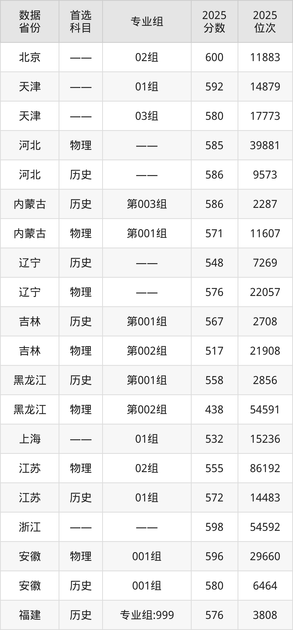 2025年南方医科大学全国录取分数线最低是438分,最高是650分,平均分在566分左右。在多数地区录取最低分均超过500分。低于500分能上的地区只有山西和黑龙江,高于平均值较多的是海南、北京、河南和浙江等地,均有专业组最低分在598分及以上。