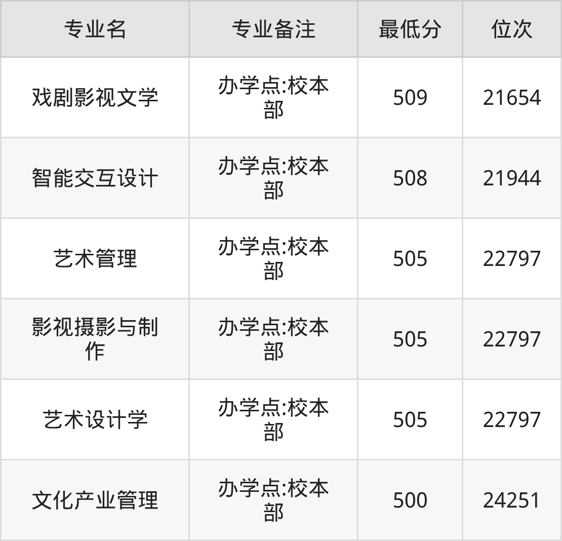 1、戏剧影视文学(办学点:校本部):509分、位次21654名;
