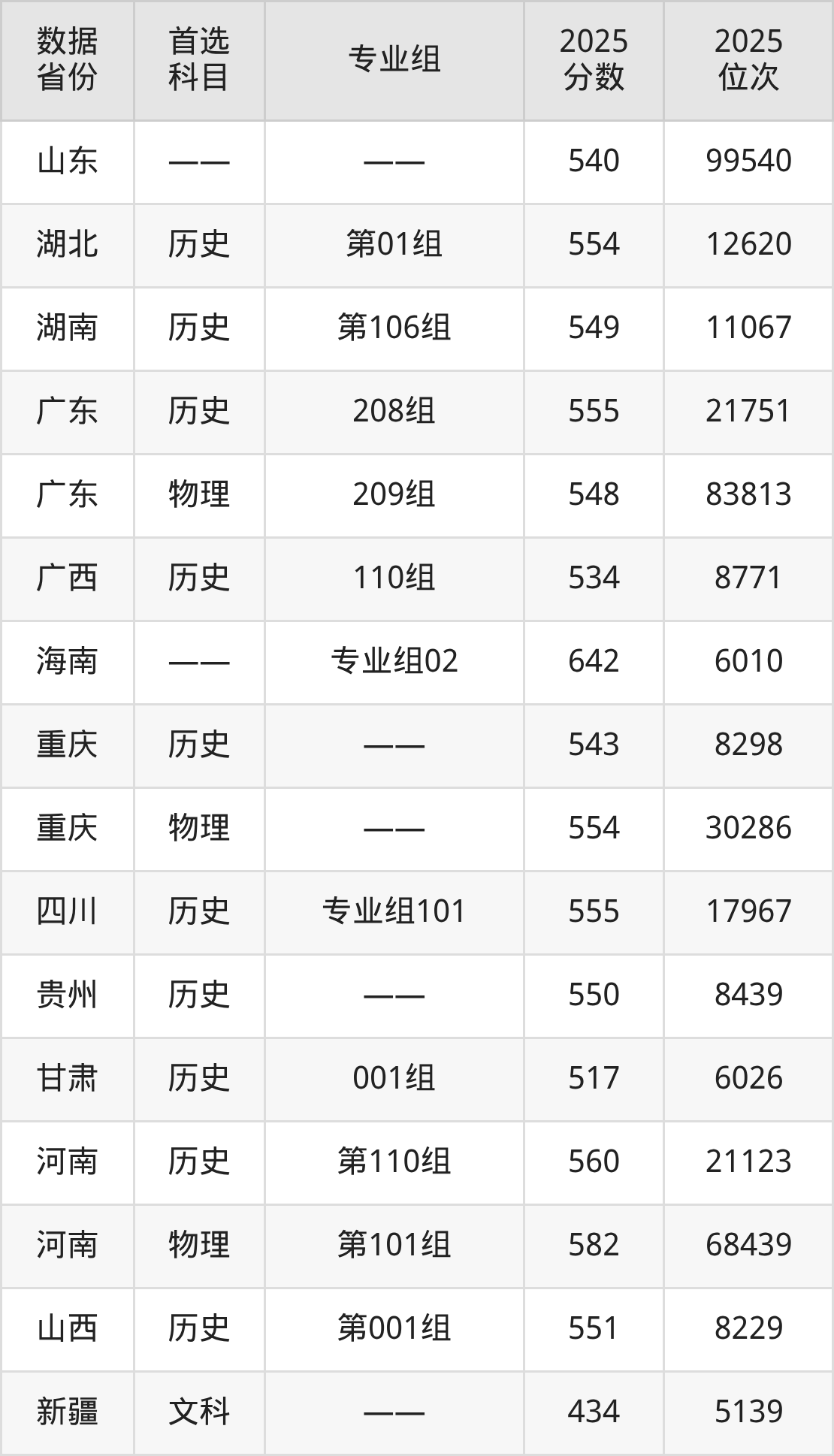 2025年南京艺术学院全国录取分数线最低是434分,最高是642分,平均分在548分左右。在多数地区录取最低分均超过520分。低于520分能上的地区只有黑龙江、甘肃和上海和新疆,高于平均值较多的是海南、浙江、河南和河北等地,均有专业组最低分在581分及以上。