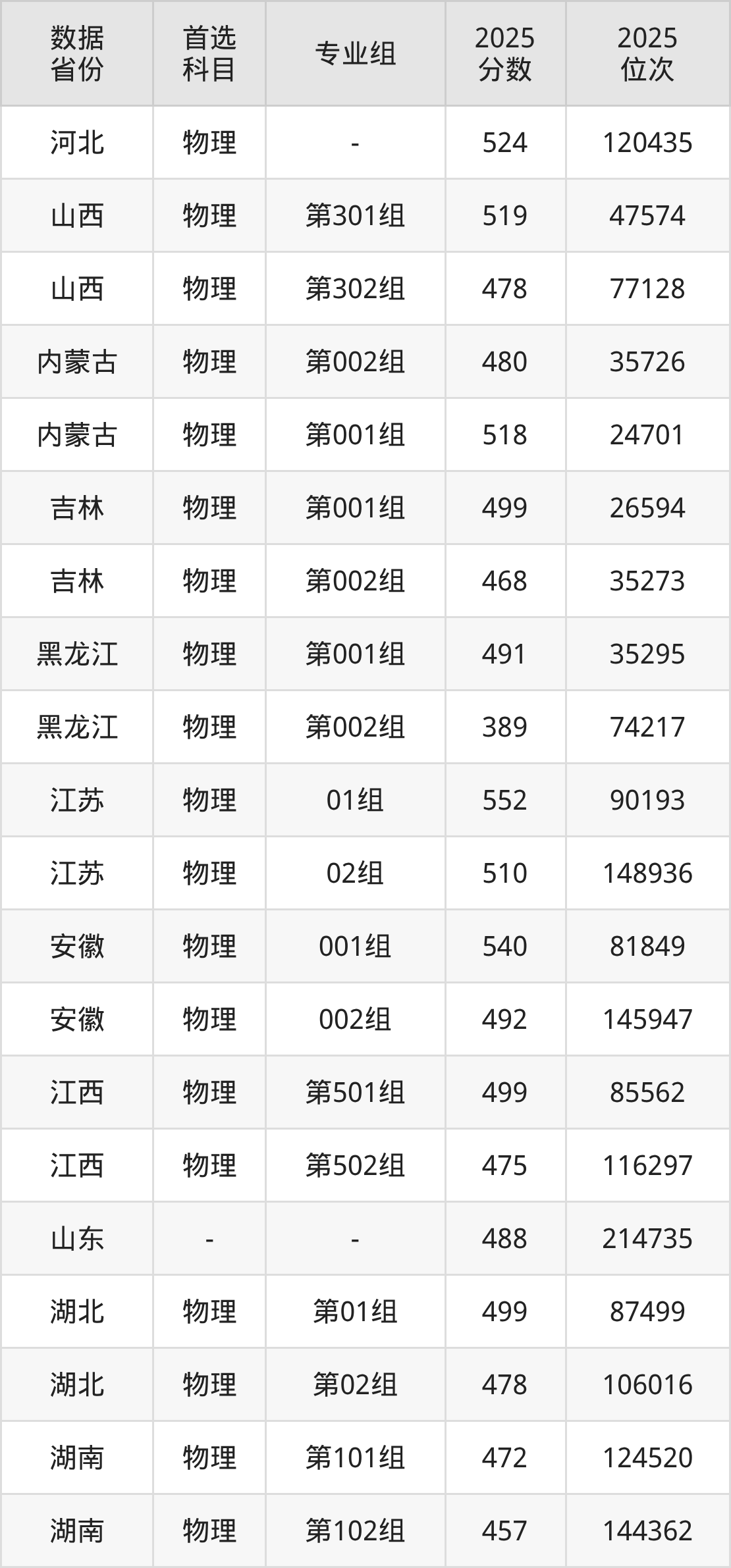 2025年甘肃医学院全国录取分数线最低是341分,最高是552分,平均分在461分左右。在多数地区录取最低分均超过390分。低于390分能上的地区只有黑龙江、新疆和甘肃,高于平均值较多的是重庆、河北、江苏和四川等地,均有专业组最低分在509分及以上。