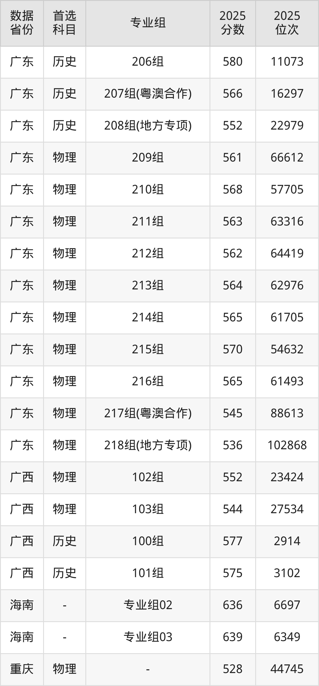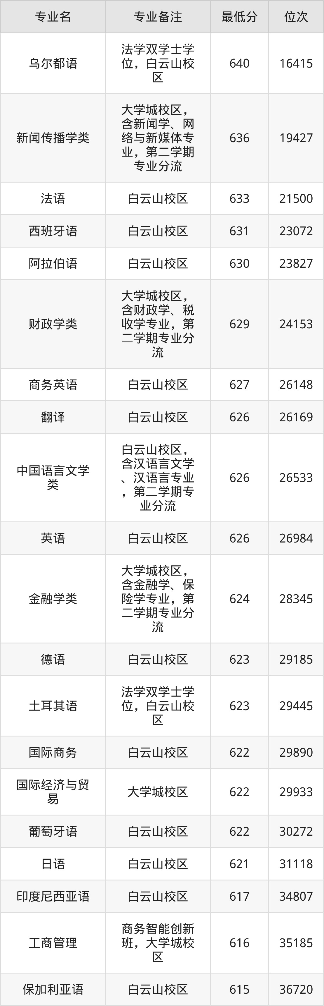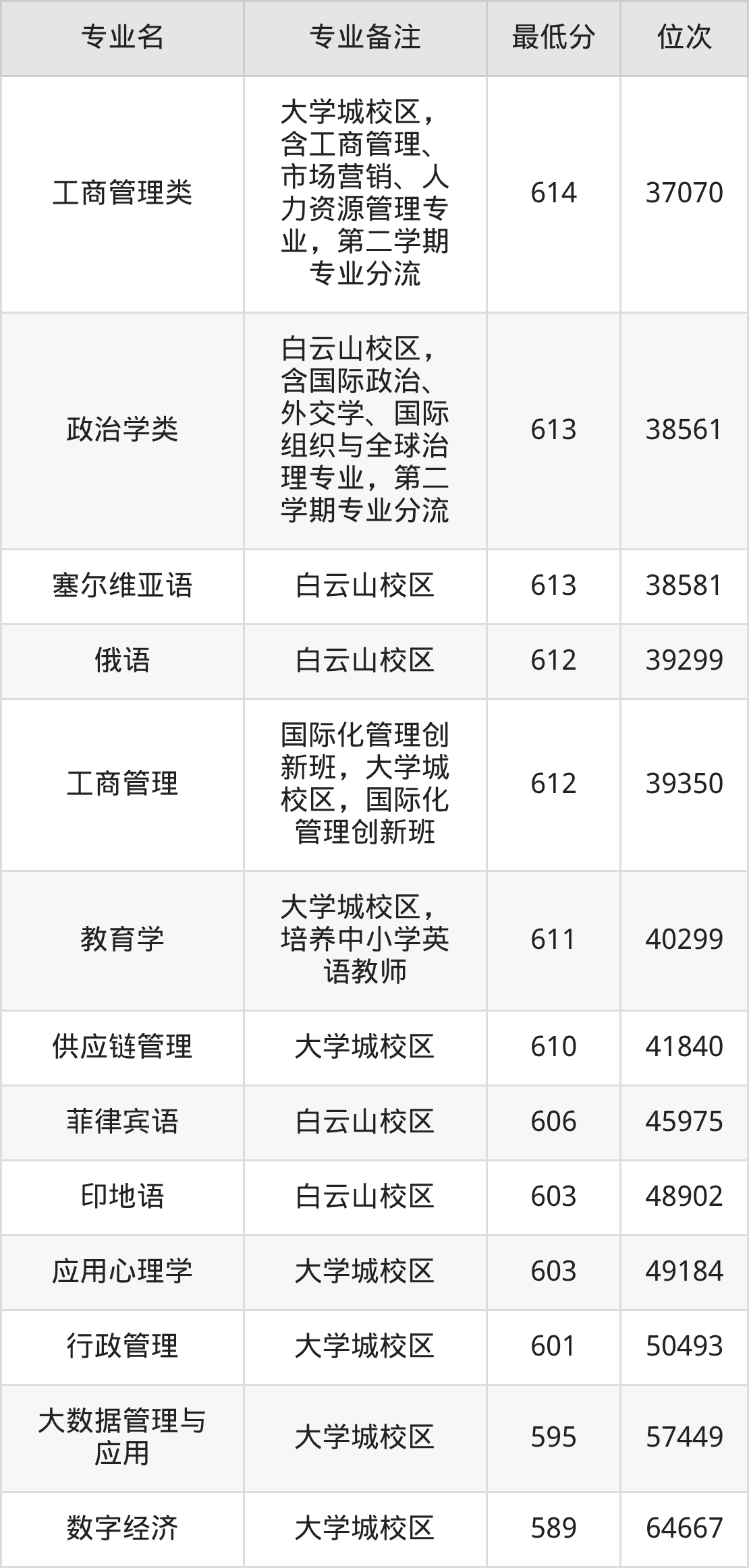 下面是广东外语外贸大学各省最低分汇总,各专业组录取分数线可参考下方图片: