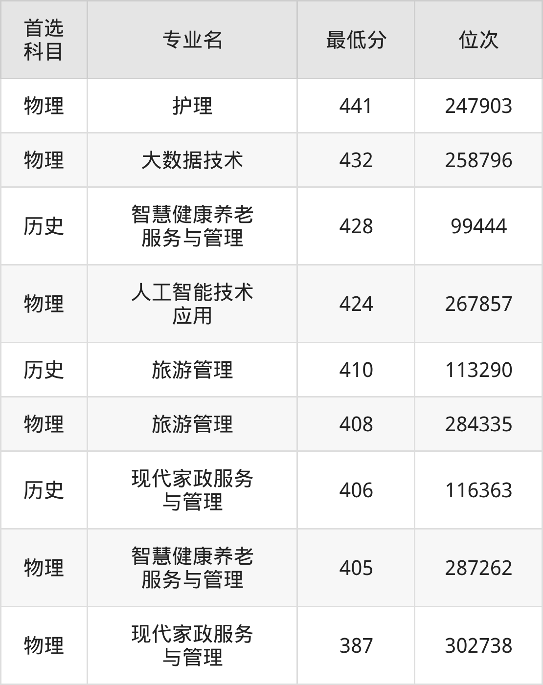 8、智慧健康养老服务与管理:405分(物理类)、位次287262名;