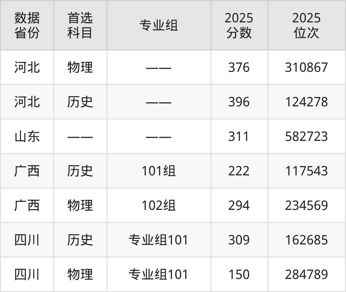 2025年驻马店职业技术学院全国录取分数线是150分到396分之间,其中在河北省录取最低分:物理组376分、历史组396分。参考山东招录数据,各专业分数线是:大数据与会计(企业财务分析)350分、小学英语教育(师范类)341分、计算机应用技术(WEB前端工程师)320分等。