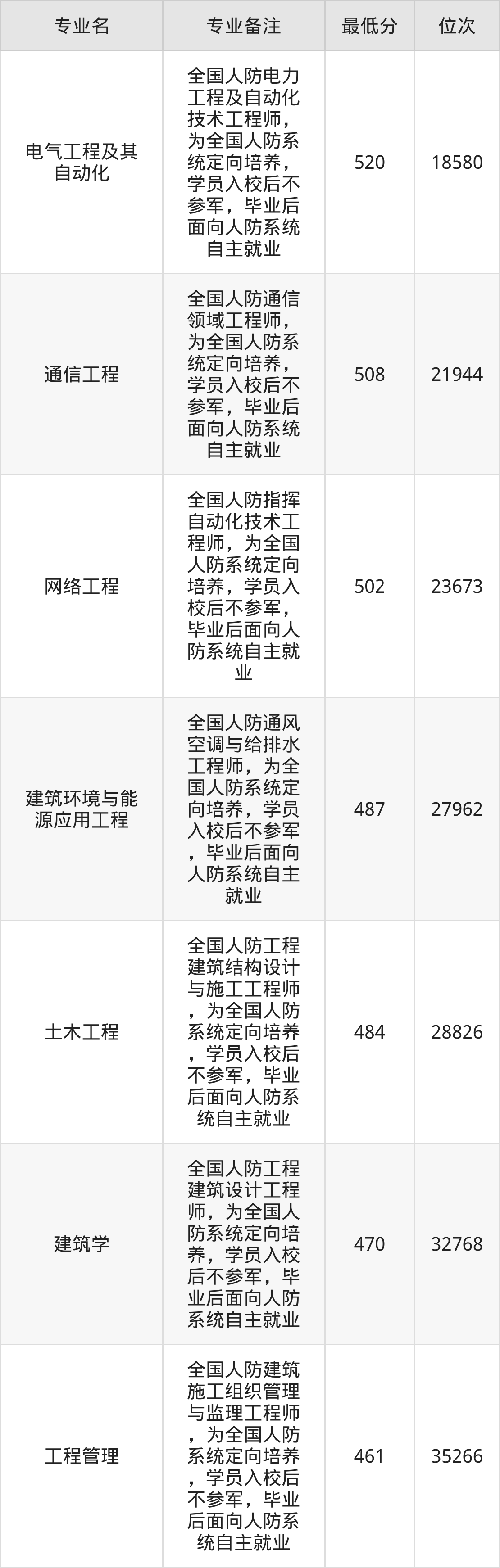 3、网络工程(全国人防指挥自动化技术工程师,为全国人防系统定向培养,学员入校后不参军,毕业后面向人防系统自主就业):502分、位次23673名;