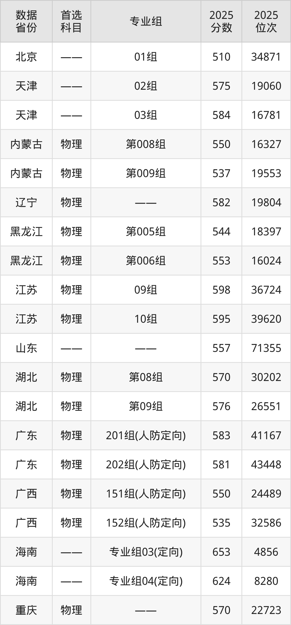 1、电气工程及其自动化(全国人防电力工程及自动化技术工程师,为全国人防系统定向培养,学员入校后不参军,毕业后面向人防系统自主就业):520分、位次18580名;