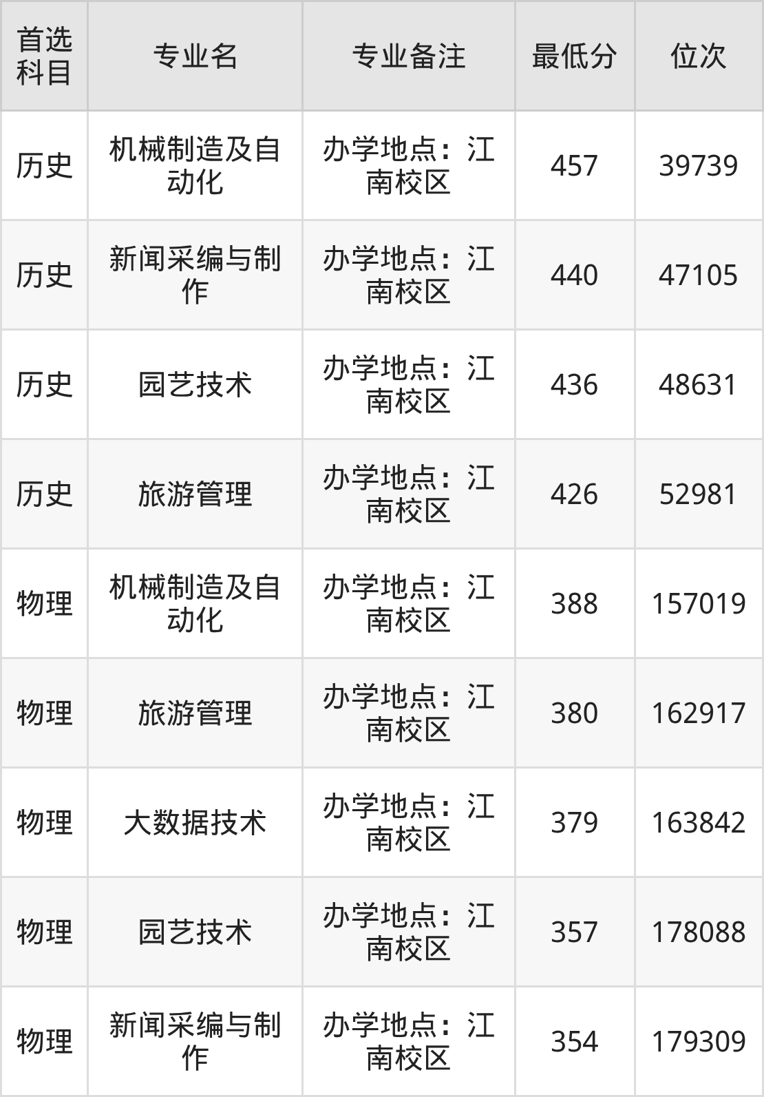 1、机械制造及自动化(办学地点:江南校区):457分(历史类)、位次39739名;