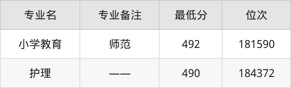 1、小学教育(师范):492分、位次181590名;