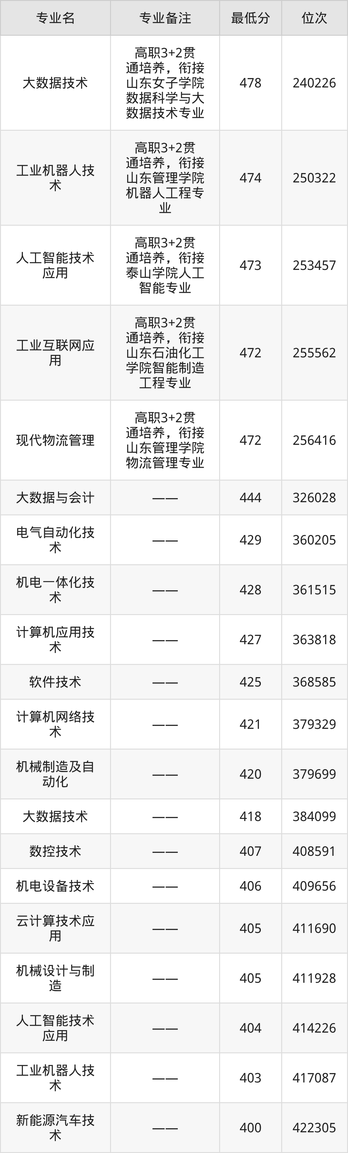 1、大数据技术(高职3+2贯通培养)(衔接山东女子学院数据科学与大数据技术专业):478分、位次240226名;