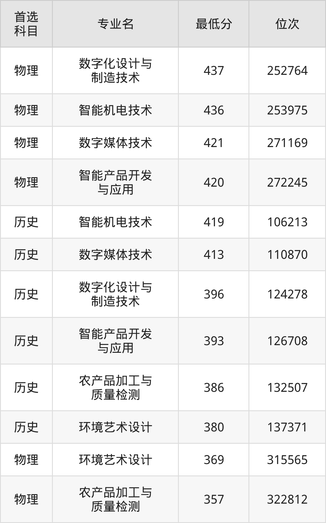 3、数字媒体技术:421分(物理类)、位次271169名;